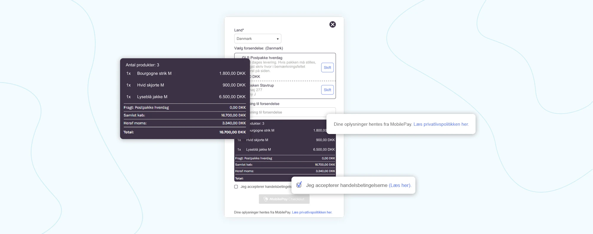Kunden skal acceptere shoppens handelsbetingelser (og have mulighed for at læse dem via link), inden der klikkes på MobilePay Checkout-knappen.